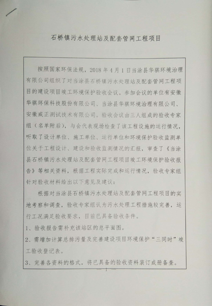按照國家環(huán)保法規(guī),2018年4月1日當(dāng)涂縣華騏環(huán)境治理有限公司組織了對(duì)當(dāng)涂縣石橋鎮(zhèn)污水處理站及配套管網(wǎng)工程項(xiàng)目的建設(shè)項(xiàng)目竣工環(huán)境保護(hù)驗(yàn)收會(huì)議。參加會(huì)議的單位有安徽華騏環(huán)保科技股份有限公司、當(dāng)涂縣華騏環(huán)境治理有限公司、安徽威正測(cè)試技術(shù)有限公司。驗(yàn)收會(huì)議由三人組成的驗(yàn)收專家組(名單附后),與會(huì)代表現(xiàn)場(chǎng)檢查了該工程設(shè)施的運(yùn)行情況,聽取了設(shè)計(jì)單位、施工單位、運(yùn)行單位和環(huán)境保護(hù)驗(yàn)收監(jiān)測(cè)單位關(guān)于工程設(shè)計(jì)、建設(shè)和驗(yàn)收監(jiān)測(cè)情況的匯報(bào),審查了《當(dāng)涂縣石橋鎮(zhèn)污水處理站及配套管網(wǎng)工程項(xiàng)目竣工環(huán)境保護(hù)驗(yàn)收?qǐng)?bào)告》等相關(guān)資料,根據(jù)工程實(shí)際完成和運(yùn)行情況,驗(yàn)收專家組針對(duì)驗(yàn)收材料給出以下意見及建議: