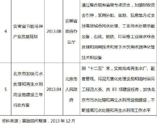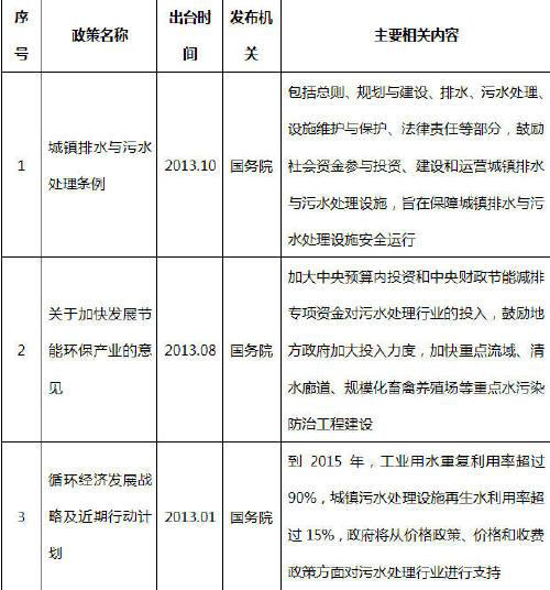 表 1 2013年部分支持污水處理行業發展的政策
