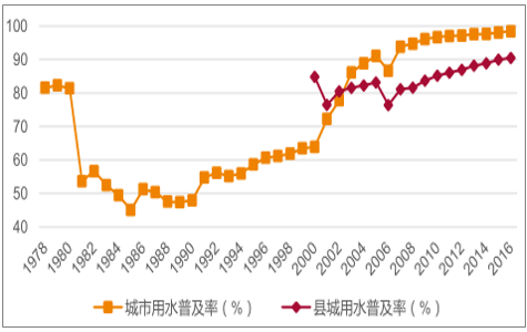 經過長期的市政供水工程規劃建設,當前我國城市和縣城地區供水體系已經基本建立完成,2016年,我國城市和縣城地區的用水普及率分別為98.42%和90.50%,已經覆蓋了縣市地區幾乎所有的常住人口。
