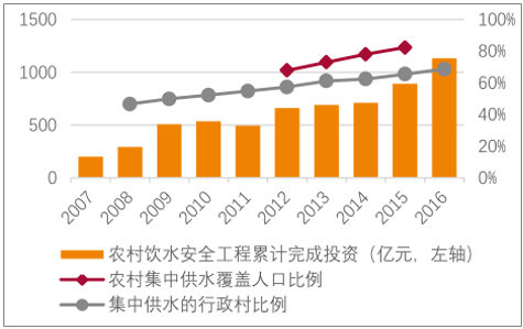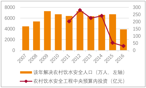 當前,農村“飲水難”問題已經基本解決,2015年,農村集中供水普及率達到82.40%;2016年,農村自來水普及率達到79%,均達到了較高水平。2015年農村飲水安全中的中央預算內投資不足僅52億,較2014年減少190億元,而2016年該投資進一步減少至30億。