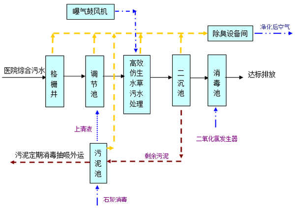本項目為南部醫療園區及頤養中心排放的污水,依據建設單位提供的信息,園區設計住院床位為850床,污水設計規模Q=550m3/d。本工程采用生物接觸氧化與消毒結合的處理工藝,使出水穩定達到《醫療機構水污染排放標準》(GB18466-2005)中的綜合醫療機構和其他醫療機構水污染排放限值(日均值)預處理標準。