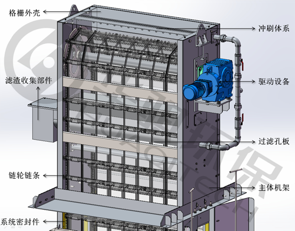 SupFTM產品結構:主要由驅動設備、主體機架、外殼、鏈輪鏈條、過濾孔板、沖刷體系、系統密封件、濾渣收集部件、及電氣控制柜等部件構成。