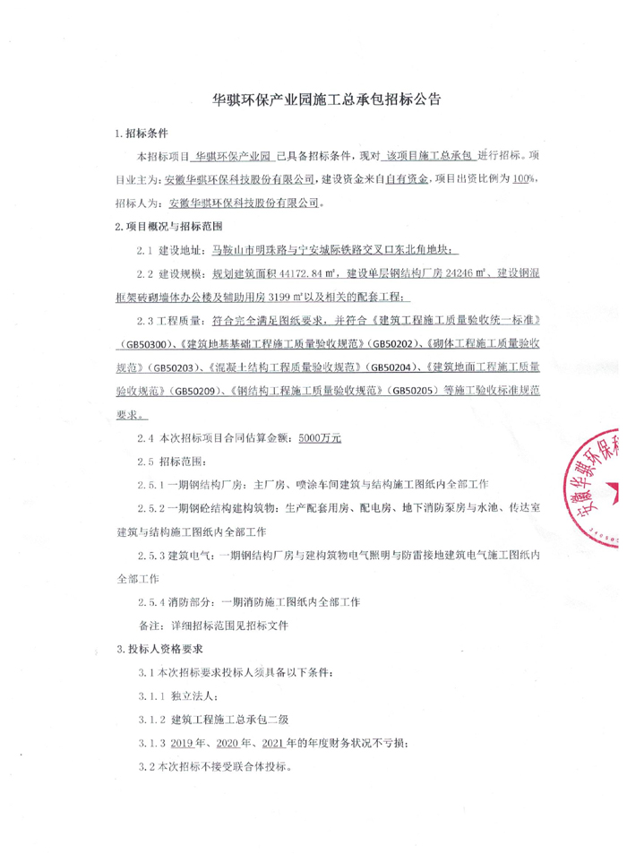 本招標項目 華騏環保產業園 已具備招標條件,現對 該項目施工總承包 進行招標。項目業主為:安徽華騏環保科技股份有限公司,建設資金來自自有資金,項目出資比例為100%,招標人為:安徽華騏環保科技股份有限公司。