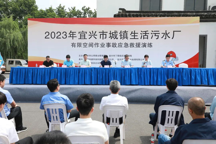 6月,小荷初露,茉莉飄香,宜興市華騏污水處理有限公司在“畢業(yè)季”里交出了一份令人滿意的答卷,宜興華騏從江蘇省76座縣級以上城鎮(zhèn)污水廠中脫穎而出,在江蘇省住房和城鄉(xiāng)建設部2021年度城鎮(zhèn)污水處理廠運行管理工作考核中獲評優(yōu)秀。而今年6月亦是第22個全國“安全生產(chǎn)月”,為進一步鞏固污水板塊安全生產(chǎn)形勢,加強污水處理行業(yè)有限空間作業(yè)管理,提高有限空間作業(yè)事故應急救援能力,6月20日,由宜興市公用事業(yè)管理局、宜興市丁蜀鎮(zhèn)應急管理局主辦,安徽華騏環(huán)保科技股份有限公司承辦的“2023年宜興市城鎮(zhèn)生活污水廠有限空間作業(yè)事故應急救援演練”在宜興市華騏污水處理有限公司開展,宜興市公用事業(yè)管理局黨組書記、局長毛俊擔任演練總指揮,華騏環(huán)保副董事長鄭俊出席并觀摩了此次演練,副總裁程曉玲做主題發(fā)言。宜興華騏污水公司、佳安企業(yè)管理公司參與演練,丁蜀鎮(zhèn)應急局、宜興市城市污水廠、宜興北控公司、歐亞華都水務公司等相關領導全程觀摩演練活動。