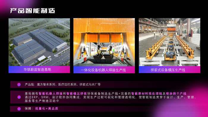 華騏環保旗下的蔚藍智能裝備制造基地,擁有包括魔方智水系列、拼裝式污水廠系列、醫療邁巴系列、精細格柵系列等多條產品線。