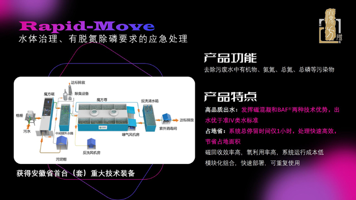 如遇同時要求脫氮除磷的提質增效或應急處理項目,可選用由魔方磁和魔方尊組合成的“Rapid-Move”系統,該系統曾獲得安徽省首臺(套)重大技術裝備,其發揮了磁混凝和BAF兩種技術優勢——系統總停留時間僅1小時,占地面積省;出水水質為準四類標準;模塊化組合,快速部署,可重復利用。