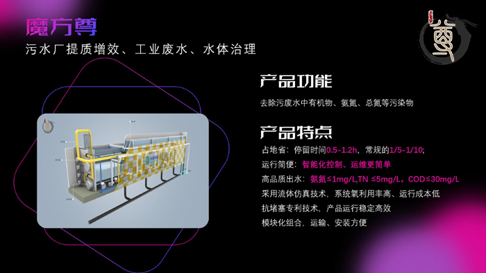 針對污水廠提質增效、工業廢水、水體治理場景中水質要求高、可用面積小、運行專業性弱的三個痛點,華騏環保量身定制了魔方尊,它采用曝氣生物濾池工藝技術,該技術先后獲得了國家科學技術發明二等獎和環境保護科學技術一等獎。魔方尊占地省,僅為常規工藝的1/3;停留時間一般在0.5-2h,結合智能運維決策系統,更懂用戶,運行更智能;出水氨氮≤1mg/L,COD≤30mg/L,TN ≤5mg/L,高品質出水。