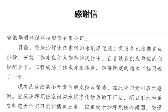 近日,長江三峽綠洲技術發展有限公司向安徽華騏環保科技股份有限公司發來感謝信,對華騏環保工作人員在建設重慶沙坪壩伍家河溝水質凈化站項目過程中,高效、有序的保障了項目…